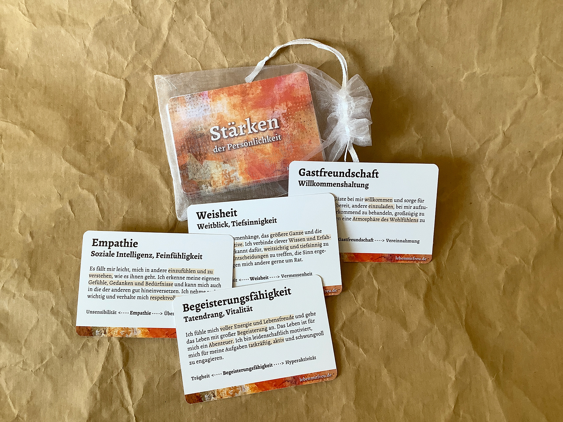 30 Karten mit Begriffen und Beschreibungen von Charakterstärken. Zusätzlich deren Unter- und Übertreibungen. 24 VIA-Charakterstärken und 6 zusätzliche Stärken. Für Coaching, Beratung, Therapie und zum persönlichen Erkunden der eigenen Stärken. 6,5 x 9,5 cm, 250g/qm Karton im Organzasäckchen.