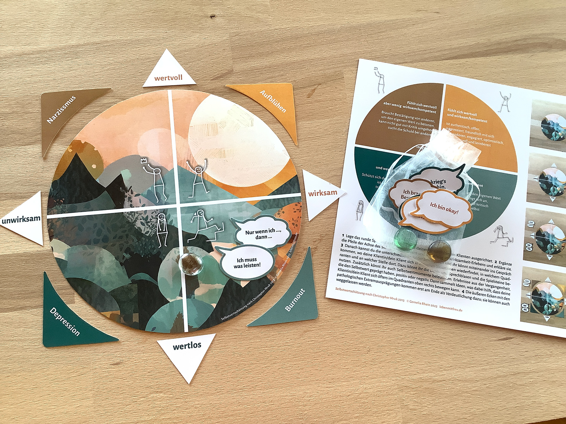 Spielfeld mit Elementen, um spielerisch und mit Leichtigkeit ins Gespräch zu kommen darüber, wie wertvoll und wirksam du dich gerade erlebst. Für Coaching, Beratung, Therapie und zum persönlichen In-Kontakt-Kommen mit der eigenen Selbstwertschätzung. Zwei DinA4-Bögen zum Ausschneiden mit Spielfeld, Elementen und Anleitung. Mit Umschlag, Spielsteinen und Säckchen zum Aufbewahren.
