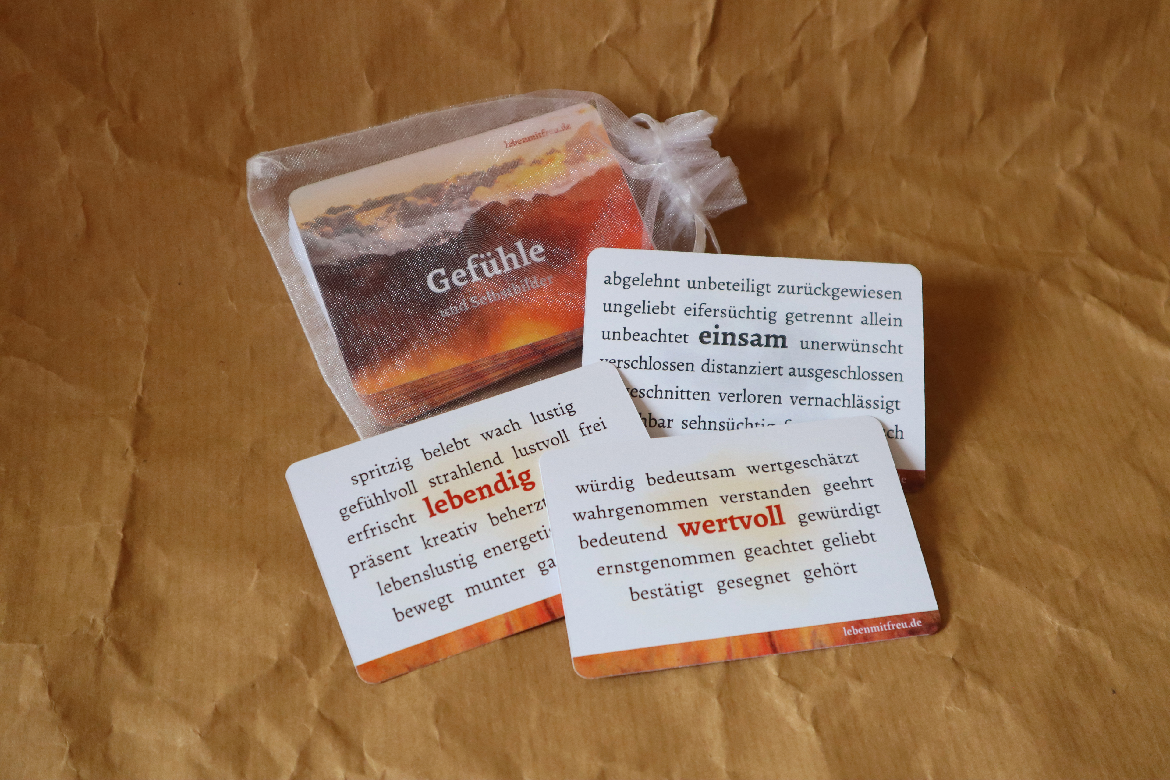 24 Karten mit Begriffen zu positiven und negativen Gefühlen und Selbstbildern. Für Coaching, Beratung, Therapie und zum persönlichen In-Kontakt-Kommen mit den eigenen Gefühlen. 6,5 x 9,5 cm, 250g/qm Karton im Organzasäckchen.