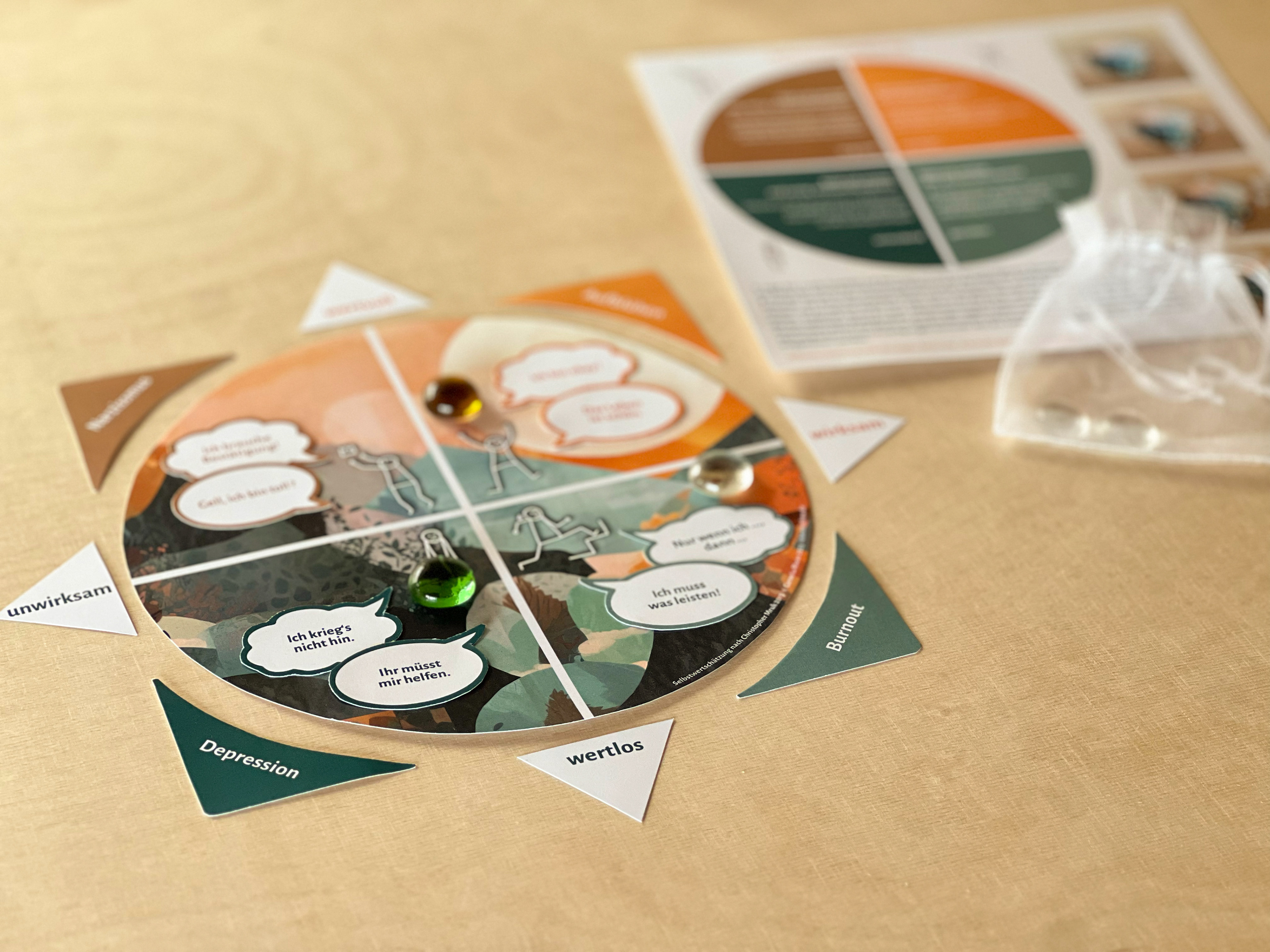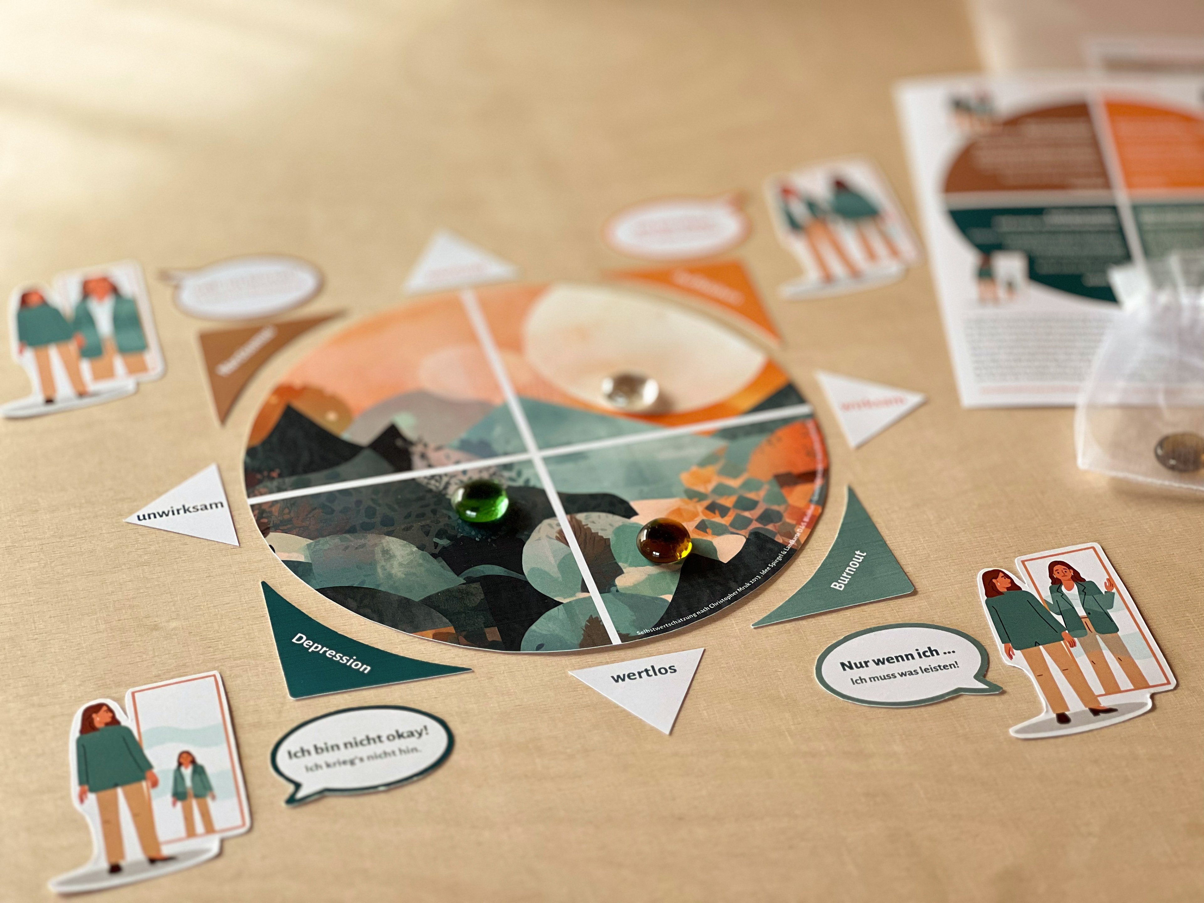 Spielfeld mit Elementen, um spielerisch und mit Leichtigkeit ins Gespräch zu kommen darüber, wie wertvoll und wirksam du dich gerade erlebst. Für Coaching, Beratung, Therapie und zum persönlichen In-Kontakt-Kommen mit der eigenen Selbstwertschätzung. Zwei DinA4-Bögen zum Ausschneiden mit Spielfeld, Elementen und Anleitung. Mit Umschlag, Spielsteinen und Säckchen zum Aufbewahren. Variante mir Spiegel-Bildern zur Erklärung.